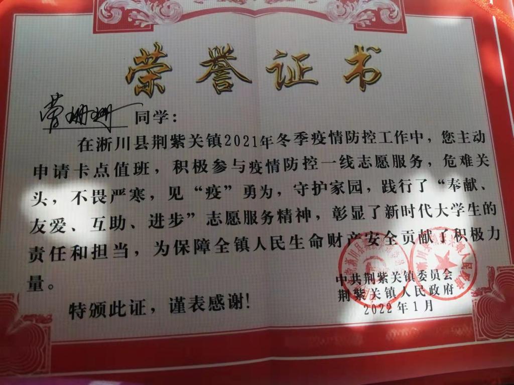 她做为一名青年大学生,从自身做起参与至疫情防控工作中,虽然天气寒冷,但是她不畏严寒,坚守岗位,提现了当代青年大学生的奉献精神,为疫情防控工作奉献了微薄之力。她表示:“作为当代青年,能为疫情防控作贡献,是对我的考验,也是一次难得的社会实践,更是一场心灵的洗礼!”同时她表示也认识到了团队的重要性,正是在各名志愿者和村干部的合作下才能圆满完成疫情防控工作。