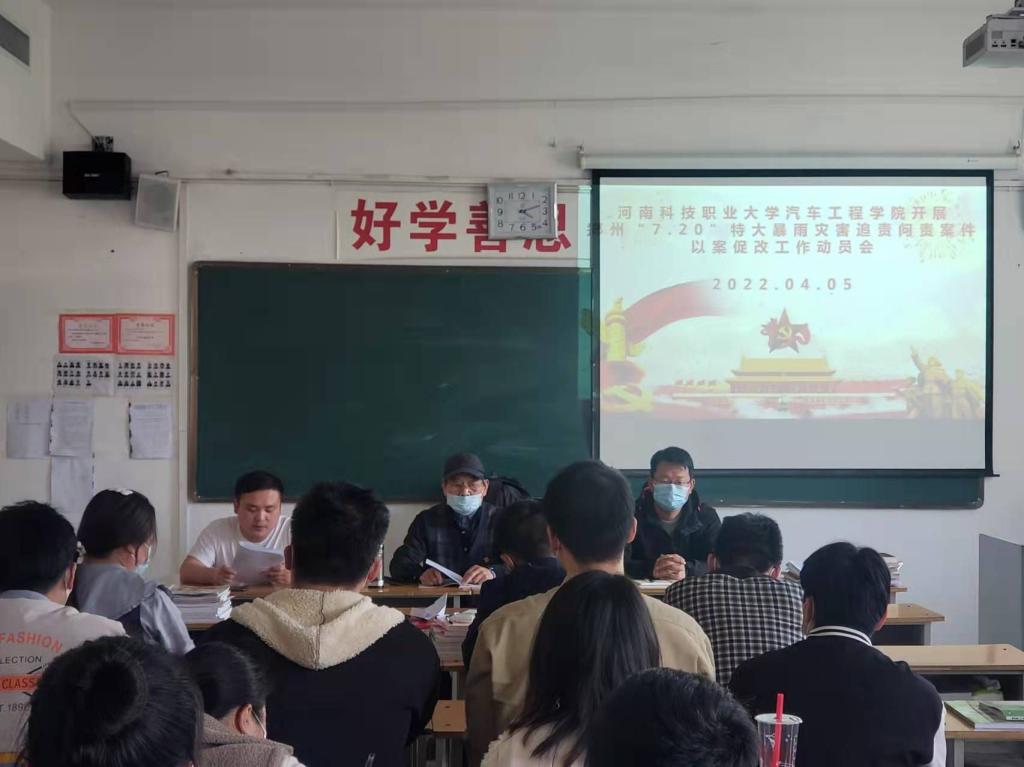 2022年4月5日,汽车工程学院开展“7.20”郑州特大暴雨灾害追责问责以案促改动员大会。此次会议,由王亚雷书记主持,李鹏院长,李振清书记以及汽车工程学院全体教师参会。